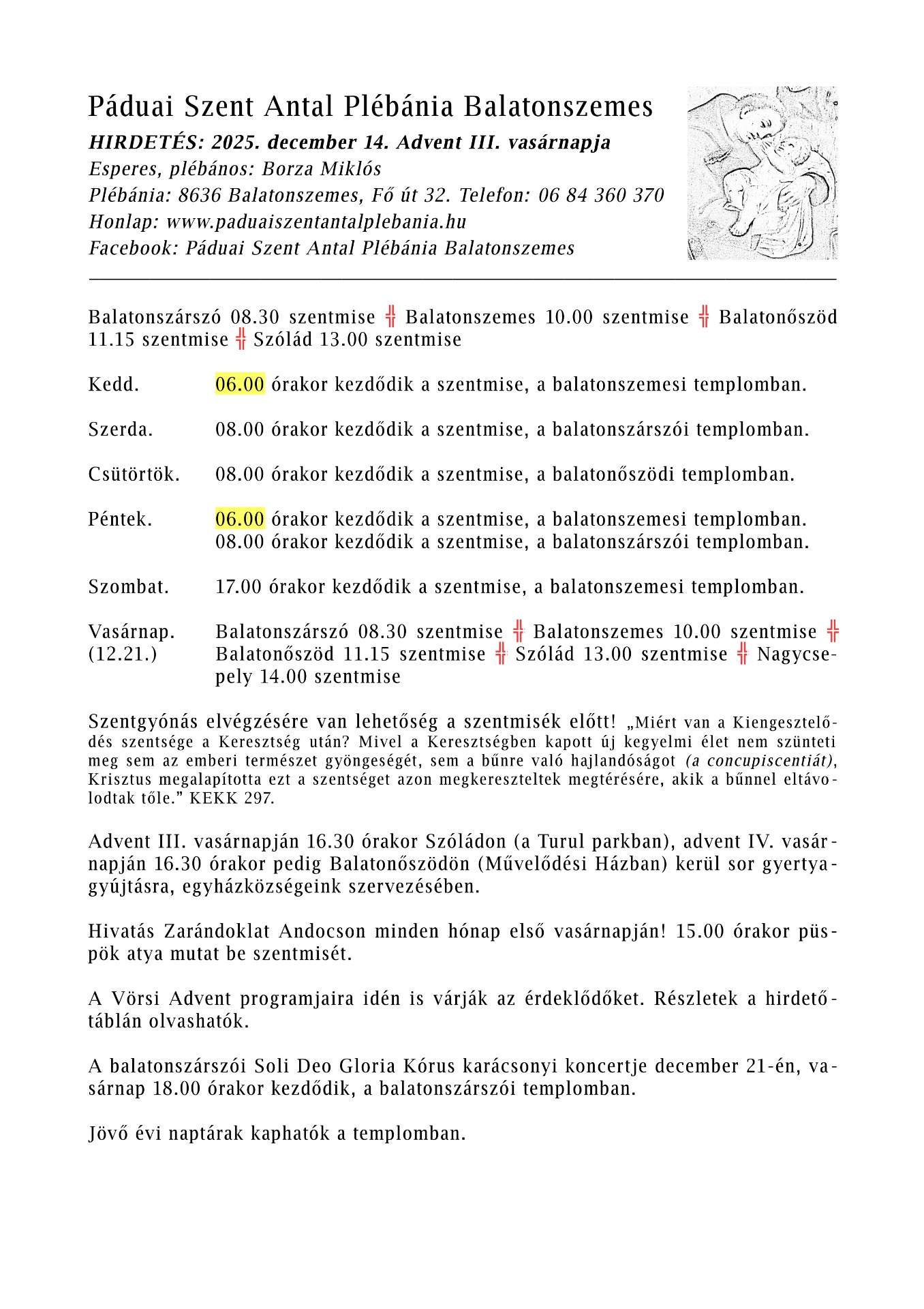 HIRDETÉS: 2025. december 14. Advent III. vasárnapja