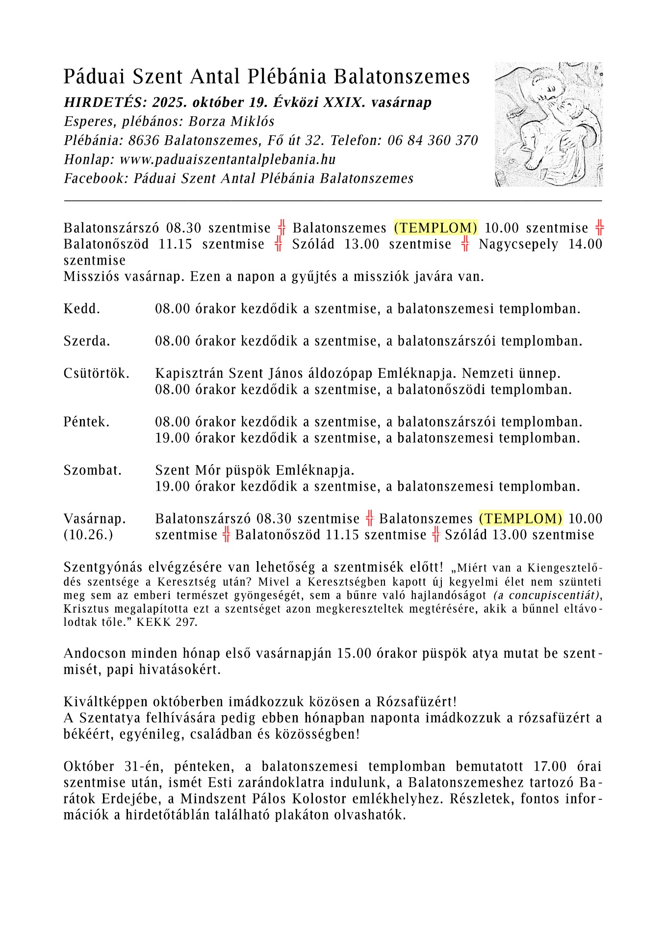 HIRDETÉS: 2025. október 19. Évközi XXIX. vasárnap