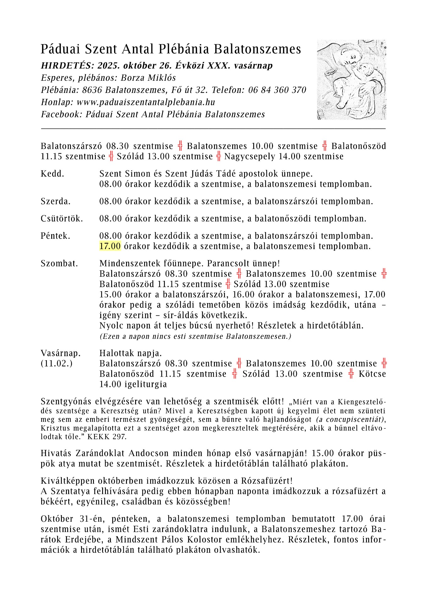 2025. október 12-étől a 10 órai vasárnapi szentmise a balatszemesi templomban kerül megtartásra. A Bagolyvár utcai kápolnánál jövő tavasztől újra várjuk a híveket a szentmiséken.
